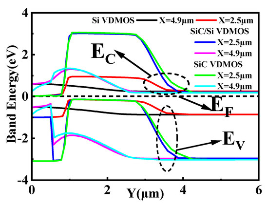 Figure 4 shows the energy bands of SiC/Si VDMOS, Si VDMOS, and SiC VDMOS during thermal equilibrium. It can be seen that for Si VDMOS, the bandgap was 1.12 eV, and the curve X = 2.5 μm was the focus of the Si VDMOS breakdown voltage (shown in Figure 1), which means that the breakdown point was located at the junction of the P-based and N-type drift regions, the site of the maximum radius of curvature of conventional Si VDMOS. Since the band gap of SiC VDMOS was 3.26 eV, curve X = 4.9 μm was the focal point of the SiC VDMOS breakdown voltage, and the BV of the device reached 1747 V. The curve X = 4.9 μm was the focus of the breakdown voltage for SiC/Si VDMOS with SiC/Si heterojunction (shown in Figure 1). Due to the high critical breakdown field strength of SiC materials, BV increased from 259 V to 1144 V compared with Si VDMOS.