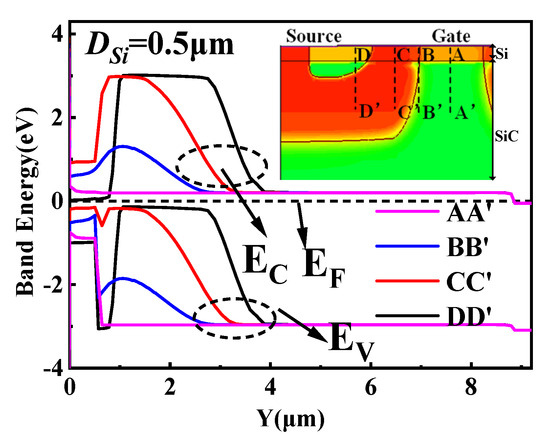 Figure 5 shows the band diagram of N−–Si/N–SiC in the middle of mesa (AA’), the P–Si/N–SiC heterojunction (BB’), the P–Si/P–SiC heterojunction (CC’), and the N+–Si/P–SiC heterojunction (DD’). To analyze the band state of the SiC/Si VDMOS heterojunction, four tangents in the y direction (AA’, BB’, CC’, and DD’) were chosen. We can see that the SiC/Si VDMOS heterojunction is affected not only by the two materials Si and SiC with different bandgaps but also by the doping concentration and different doping types at different regions of the device, which change the heterojunction bandgap of SiC/Si VDMOS.