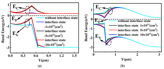 The energy band diagram of SiC/Si VDMOS with different interface state charges (acceptorlike) is shown in Figure 6a. In this figure, as the interface concentration increases, the energy at the SiC/Si heterojunction rises slightly due to the p-type trap layer introduced by the interface charge (acceptor) at the SiC/Si heterojunction interface. This results in an increase in the barrier height difference at the heterojunction, resulting in an increase in the BV of SiC/Si VDMOS (shown in Figure 3a). Further, since the height of the barrier becomes high, electrons do not easily flow, and thus, Ron,sp increases (shown in Figure 3b). Figure 6b shows the influence of different interface state charges (donors) on the energy band diagram of SiC/Si VDMOS. Electrons were induced in the inversion layer at the SiC/Si heterojunction interface. As the interface concentration increased, the number of electrons in the channel increased, resulting in an increase in the electron current. The decrease in the barrier height resulted in a decrease in the BV of SiC/Si VDMOS, which facilitated electron flow and caused a decrease in Ron,sp (shown in Figure 3a,b).