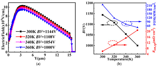 Figure 7a shows the vertical electric field distributions for SiC/Si VDMOS at the temperature range of 300 K to 360 K. It can be seen that the highest electric field of the SiC/Si VDMOS reached 9.8 MV/cm, and BV was 1144 V at 300 K [25,26,27,28,29]. When the temperature was increased to 360 K, the maximum electric field of the SiC/Si VDMOS dropped to 8.8 MV/cm, and BV dropped to 1000 V. The dependences of BV, Ron,sp, and figure-of-merit (FOM = BV2/Ron,sp) changes from 300 K to 360 K for the SiC/Si VDMOS are shown in Figure 7b. It was found that the BV of SiC/Si VDMOS decreased from 1144 V to 1000 V as the temperature increased. In addition, the Ron,sp of SiC/Si VDMOS increased, yielding a FOM (217 MW/cm2) of SiC/Si VDMOS that dropped to 48 MW/cm2.