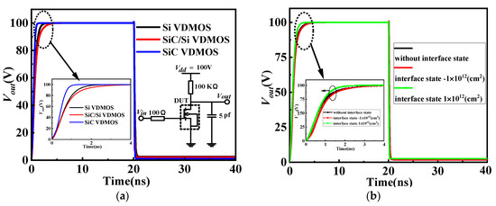 (a) Switching characteristics under resistive load for the SiC/Si VDMOS, Si VDMOS, and SiC VDMOS, and (b) the influence of different interface state charges on the switching characteristics for SiC/Si VDMOS.