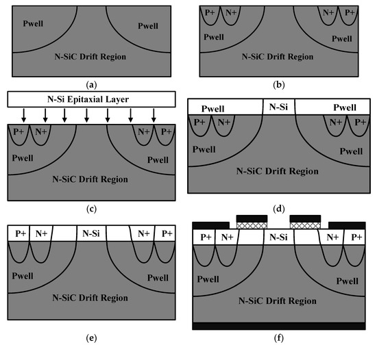The key processes for the feasibility of manufacturing SiC/Si VDMOS are shown in Figure 12, and some key processes are similar to Si VDMOS. The formation of the SiC/Si drift region can be achieved by the method in Ref. [22]. The simplified wafer bonding process is as follows: (a) ion implantation forms a P-well in the N–SiC drift region; (b) ion implantation to form source region; (c) epitaxial growth of N–Si Layer; (d) wafer bonding is carried out and ion implantation is made to form the portion of the P-well in the N–Si layer; (e) ion implantation to form the portion of the source in the N–Si layer; and (f) the gate oxide layer grows, the field oxide layer grows, and then the source electrode and the drain electrode are contacted.