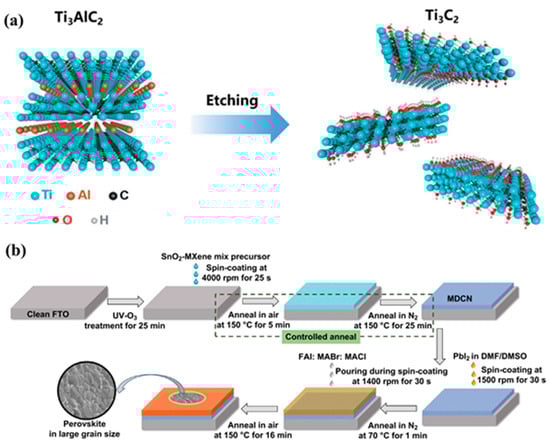 Schematic presentation for the preparation of MXene (a) and fabrication of PSCs (b). Reprinted with permission from Refs. [,].