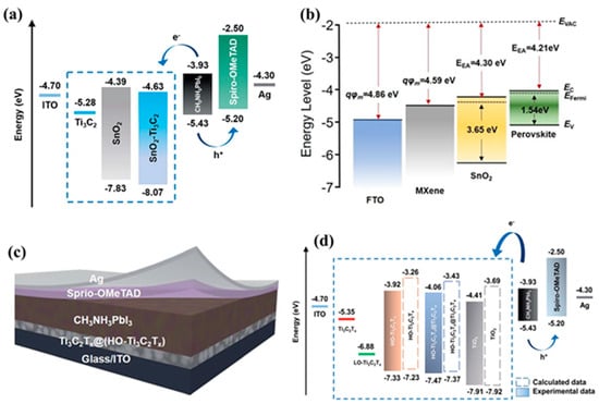 Energy level diagrams (a,b,d) and schematic diagram (c) of the MXene-based PSCs. Reprinted with permissions from Refs. [,,].