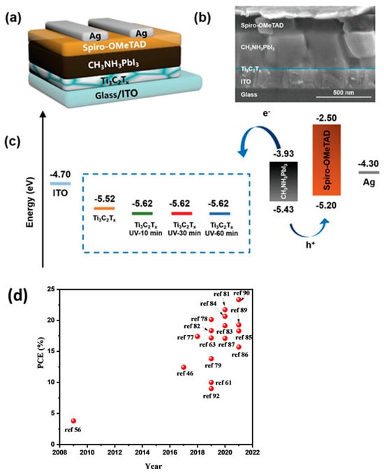 The developed PSCs device exhibited a high PCE of 20.6% with good stability up to 3 months. The introduction of Ti3C2Tx MXene enhanced the device stability as well as photovoltaic performance. This suggested the potential application of Ti3C2Tx MXene in the development of PSCs. In 2021, Yang et al. [] prepared Ti3C2Tx MXene and investigated its properties for photovoltaic applications. The schematic picture of the developed PSCs is presented in Figure 3d. The energy level values of the Ti3C2Tx MXene and other components have been summarized in Figure 3d. Authors found that energy level values of the Ti3C2Tx MXene are well-matched with the energy values of the ITO and TiO2. The developed PSCs using Ti3C2Tx MXene showed the highest PCE of 18.29%. In other work, an interesting PCE of 15.71% was also obtained using Ti3C2Tx MXene as dopant []. Yang et al. [] developed the planar structured PSCs using Ti3C2Tx MXene as an electron transport layer. The schematic diagram of the fabricated PSCs is depicted in Figure 4a. The cross-sectional SEM image of the developed PSCs is presented in Figure 4b, which is clearly showing the presence of interlayers. Yang et al. [] investigated the effect of UV-ozone treatment. The observations showed that UV-ozone treatment slightly influenced the work function of the Ti3C2Tx MXene (Figure 4c). The UV-ozone treatment enhanced the surface Ti-O bonds without affecting electron mobility, which suggested its potential use as an electron transport layer. The developed PSCs using Ti3C2Tx MXene as an electron transport layer exhibited the excellent PCE of 17.17% []. In some other recent reports, Ge et al. [] investigated the role of Ti3C2 quantum dots in PSCs and obtained the highest PCE of 16%.
