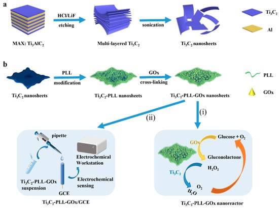 Schematic representation of the formation of the Ti3C2-PLL-GOx nanoreactor (a,b) and its application for cascade glucose oxidation (i) and electrochemical glucose sensing (ii) []. Reprinted with permission [].