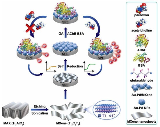 Zhao et al. [] also fabricated a biosensor for the determination of pesticides. Figure 6 exhibits the fabrication of the biosensor. In this research, bimetallic nanoparticles consisting of a combination of gold and palladium (Au-Pd NPs) were synthesized through self-reduction occurring on the surface of ultrathin MXene nanosheets (Ti3C2Tx).