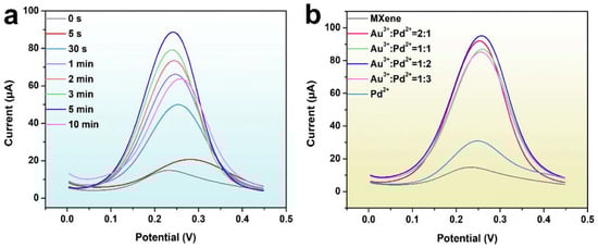DPV response of SPE/MXene/Au-Pd with (a) different growth time of Au-Pd NPs and (b) different concentration ratios of Au3+ to Pd2+ in 0.1 M KCl solution containing 5.0 mM K3[Fe(CN)6] []. Reprinted with permission [].