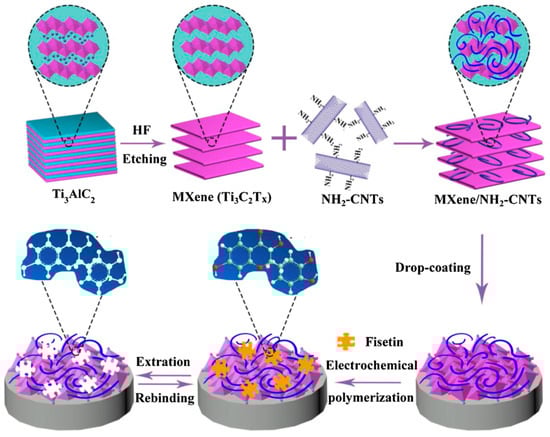 Authors fabricated an alk-Ti3C2/N-PC electrochemical sensor for detecting hydroquinone (HQ) and catechol (CT) in industrial wastewater. In addition to using N-PC to prevent restacking, they treated the Ti3C2 MXene sheets with an alkaline intercalation process. This treatment led to the presence of abundant -OH groups on the MXene surface, which facilitated hydrogen-bond interactions for sensing HQ and CT. The resulting alk-Ti3C2/N-PC electrochemical sensor displayed low detection limits of 4.8 nM for HQ and 3.1 nM for CT, covering a broad linear range from 0.5 to 150 μM. Selectivity poses a challenge in the practical use of electrochemical sensors for targeted measurements. Molecularly imprinted polymers (MIPs) offer a solution to enhance sensor selectivity through specific recognition properties, cost-effectiveness, and quick synthesis. Ma et al. [] developed a sensitive and selective electrochemical sensor for detecting fisetin using a hierarchical porous Ti3C2 MXene/amino carbon nanotubes (MXene/NH2-CNTs) composite combined with MIP (Figure 9).