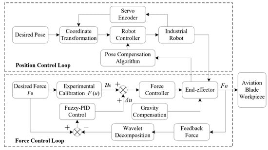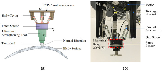 In the process of robot ultrasonic surface strengthening, the contact force applied by the strengthening tool on the workpiece surface is crucial for the formation of residual stress layers. The contact force not only ensures the stability of the strengthening tool vibration but also serves as a key factor in inducing elastic–plastic deformation of the workpiece material. Therefore, during the feed motion of the strengthening tool along the planned path, it is necessary to maintain a constant normal contact pressure between the tool head and the strengthening area, as shown in Figure 1a. This implies that the output force in the Z-axis direction of the TCP coordinate system needs to be controlled during the strengthening process. However, in the interaction process between the ultrasonic strengthening tool and the aviation blade surface, due to the influence of the dynamic environment, the geometric path of the tool will be constrained. The error of calibration and trajectory planning may cause the tool to deviate from the target trajectory, resulting in a change in the contact force. The rigidity of industrial robots, blade workpieces, and the working environment is relatively large. In order to obtain the desired output contact force and tool pose, the control model needs to be very accurate [30], but this is difficult to achieve in actual control tasks. The coupling of force control also makes the control system more complex. In addition, the coupling of pose control and force control makes the control system more complicated.