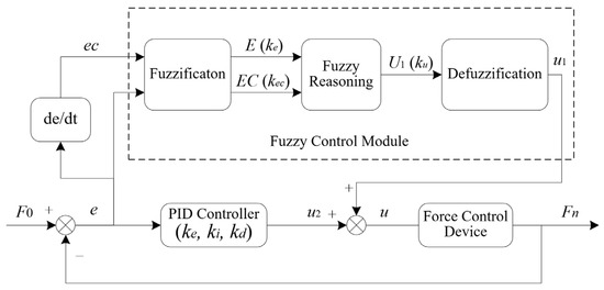 Figure 3 indicates the parallel fuzzy PID control method, in which fuzzy control and PID control are completely juxtaposed with each other to control the system in a parallel way. According to the given input and feedback signals, the fuzzy controller calculates the deviation e and the current deviation variation rate ec and then makes fuzzy inferences using fuzzy rules. At the same time, the PID control method is used to adjust the control system. The output values of fuzzy control and PID control are combined to adjust the output value of the system. This parallel control method can not only avoid the steady-state error caused by fuzzy control but also improve the deficiency of PID control in an unsteady system to a large extent. Compared with the conventional serial fuzzy PID control method, this algorithm is easier to implement and more suitable for engineering practice. Therefore, the parallel fuzzy PID control method is selected to control the output contact force of the end-effector.