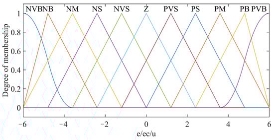 where ae and be indicate the actual variation interval [ae, be] of the input deviation e, aec and bec indicate the actual variation interval [aec, bec] of the input deviation variation rate ec, au and bu indicate the actual variation interval [au, bu] of the system output value u, and n is their domain of discourse.