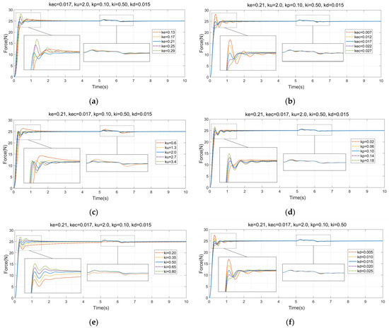 The effect of the quantization factors on the system response of fuzzy PID control. (a) The effect of ke; (b) the effect of kec; (c) the effect of ku; (d) the effect of kp; (e) the effect of ki; and (f) the effect of kd.