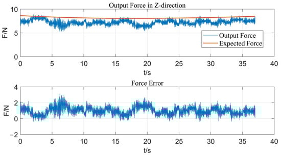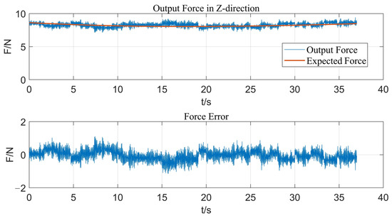 Figure 7 shows the output force response curve of fuzzy control when strengthening along this path. With the fuzzy control method, the response speed of the output force of the end-effector is relatively rapid, but there is always obvious steady-state error in the control process, and the output force error is in the range of 0–3 N, so the control effect cannot meet actual ultrasonic strengthening requirements. Then, fuzzy PID control is used, and the experimental result is shown in Figure 8. The actual output force can well follow the expected force, and the output force error is kept within ±1 N, which meets the control precision requirements and effectively eliminates the steady-state error caused by fuzzy control. This is because the control deviation of the system is usually large at the initial stage of the control process; therefore, the fuzzy control module can rely on its advantages of rapid adjustment to make the system quickly approach the target value with no overshoot or small overshoot and improve the dynamic characteristics of the system. When the deviation is small, the PID control module has the advantages of high control precision and small static error, which improves the steady-state precision of the system. Therefore, by adopting the parallel design of fuzzy control and PID control, the two algorithms will not interfere with each other, and each one will control according to the deviation between the feedback value and the target value of the current system based on their control laws. It effectively avoids the influence of unreasonable parameters of the former control algorithm on the performance of the latter control algorithm in serial control.