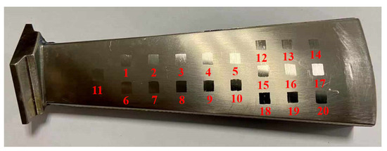 The blade workpiece is machined using the milling process. Some studies have shown that precision milling can obtain good machining quality [39,40], but milling processes will create tensile stress on the blade surface. Ultrasonic surface strengthening can create a residual compressive stress layer on the blade surface, significantly improving fatigue resistance. Also, higher surface smoothness and surface hardness can be achieved. Considering the cost of relevant experiments, we first conduct experiments to study the effect of robotic strengthening parameters on surface roughness and surface hardness. Finally, residual stress testing is conducted on the surface that is strengthened with the optimized parameters. The blade surface is divided into 20 test areas, as shown in Figure 9. Each area is 5 mm × 5 mm in size and contains about 15 paths, which can effectively carry out the experimental verification of ultrasonic strengthening. According to the experimental parameters set in Appendix A Table A1, robotic ultrasonic surface strengthening is carried out in each area, and the experimental results are the surface roughness reduction value and surface hardness value of the workpiece after strengthening. The surface roughness is measured with a white light interferometer (MicroProf WLI). The surface hardness is calculated by the average hardness value measured using a Richter hardness tester at five test points in each test area.