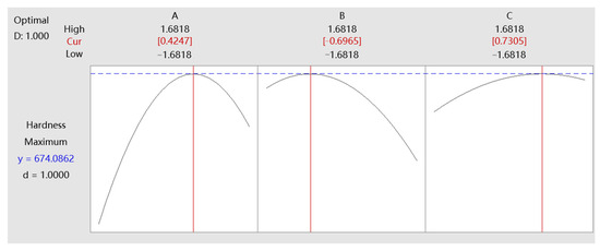 Figure 10 and Figure 11 show the response optimization curves of contact force, feed rate, and repetition times to surface roughness and hardness, respectively, from which the combination of the optimal parameter levels of the three factors can be obtained.