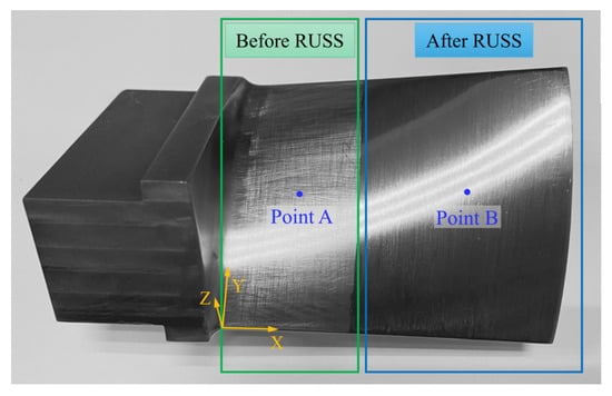 The blade surface after robotic ultrasonic surface strengthening is shown in Figure 12. From this figure, it can be intuitively observed that the blade surface quality is significantly improved. In contrast with the other half of the surface that has not been strengthened, the scratches and cutting textures on the previous surface disappear, and the surface becomes smooth and uniform.