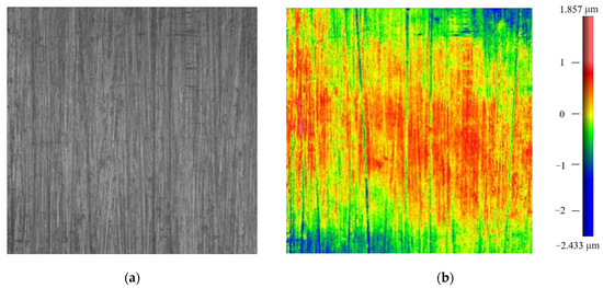 Surface micrograph of the aviation blade after robotic ultrasonic surface strengthening. (a) Micrograph 1 mm × 1 mm. (b) Surface morphology 1 mm × 1 mm.