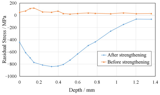 Ultrasonic surface strengthening can produce a residual compressive stress layer on the workpiece surface, which has a significant effect on improving the wear resistance and fatigue resistance of the workpiece. σxx is measured to analyze the residual stress on the blade surface. Points A and B in Figure 12 are the measurement positions, located in the center of their respective regions. The residual stress is measured using the X-ray diffraction method. As shown in Figure 15, after robotic ultrasonic strengthening, the residual tensile stress on the blade surface is converted into a larger residual compressive stress. The maximum residual compressive stress on the blade surface can reach 841 MPa, and the depth of the compressive stress layer is close to 1.2 mm. Therefore, after robotic ultrasonic strengthening, the surface of the titanium alloy blade can have a deep compressive stress layer with large residual compressive stress, which effectively improves the resistance to fatigue crack propagation of the blade and greatly prolongs its service life.