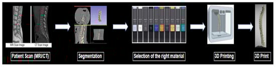 In order to construct accurate imaging phantoms through SLA printing, a thorough understanding of the attenuation properties of these resins is necessary. Although many manufacturers list the physical properties of materials such as Shore hardness or Young’s modulus, expected linear attenuation values measured by Hounsfield units (HU) are often not listed. The particular HU value for a material is dependent upon the electron density of the material as well as the CT peak kilovoltage (kVp) setting chosen [9,10]. This information is crucial for physicians’ and researchers’ informed selection of physiologically similar biomaterials. An illustration of the process to make a 3D-printed phantom is shown briefly in Figure 1.