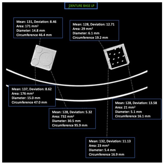Axial CT image of Denture Base LP cube phantoms and ROI placement with imaging parameters.