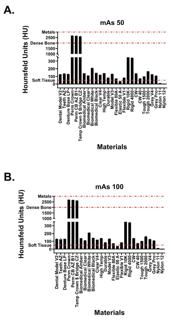 Attenuation values of Formlabs materials at tube currents of (A) 50 mAs and (B) 100 mAs. Red dotted lines signify attenuation values for physiological structures.