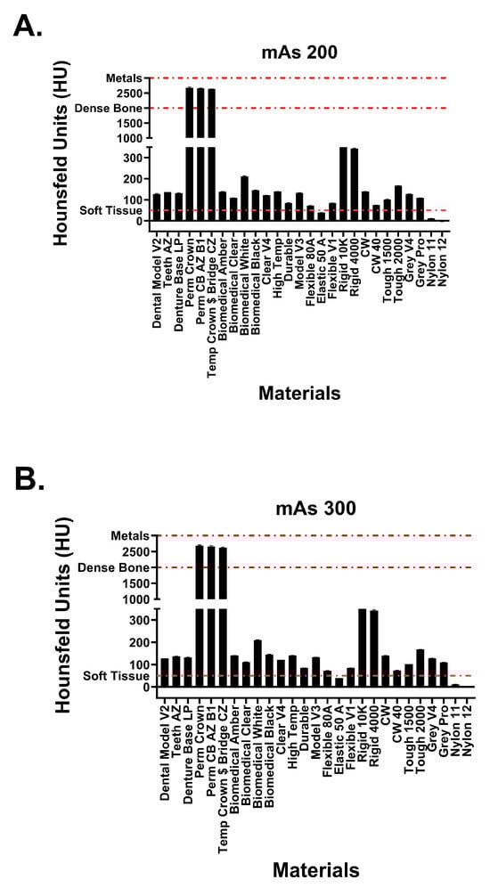Attenuation values of Formlabs materials at tube currents of (A) 200 mAs and (B) 300 mAs. Red dotted lines signify attenuation values for physiological structures.