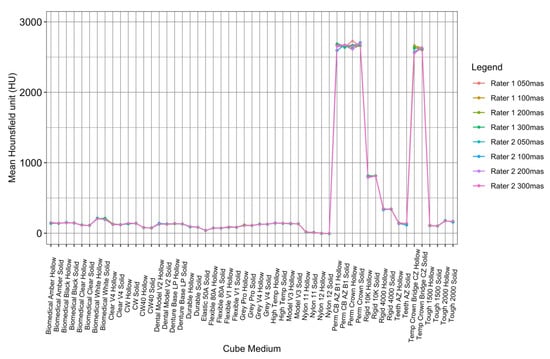 There were no significant changes or trends in attenuation observed as the tube current varied. However, this further supports the high level of reliability exhibited between the two raters scanning the resins multiple times, as shown in Figure 7.