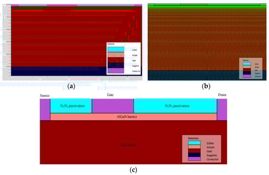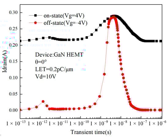 2]. Single-event transient effects refer to a phenomenon in which a single high-energy particle is incident to a semiconductor device. Due to ionization energy deposition, a large number of electron–hole pairs are induced in the device, and a pulse current is formed after the electron–hole pair is collected by the electric field, resulting in a change in the working state of the device. Compared with silicon-based devices, GaN HEMTs have better physical characteristics, such as large electron mobility, high electron density, large band gap, high breakdown field strength, high temperature resistance, and high electric pressure ability [