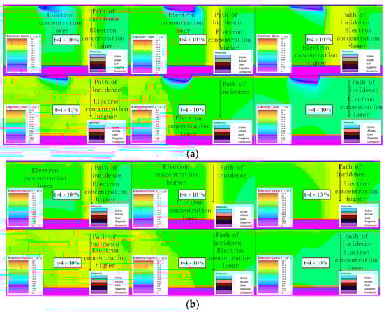 Figure 5a that when the device is in off-state (Vg = −4 V), the electron concentration in the region below the gate is very low, and there is no significant increase in the electron concentration in this region until the charge is collected. This indicates that due to the negative bias of the gate, the 2DEG channel is turned off, and the drain cannot collect charge through the channel, so it can be speculated that the charge is collected by the drain through the charge leakage path under the 2DEG channel, which has a more serious impact on the device. When the device is in on-state (Vg = 4 V), as shown in