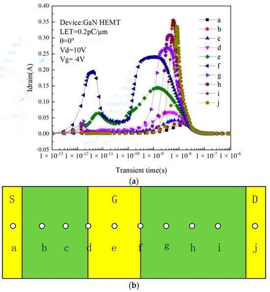 13]. Khachatrian et al. studied the single-event transient effects of AlGaN/GaN HEMTs by carrier injection through single-photon absorption by ultraviolet pulses, and the results showed that the transient current peak and shape largely depend on the position of the injected carriers and change with the gate and drain bias conditions [