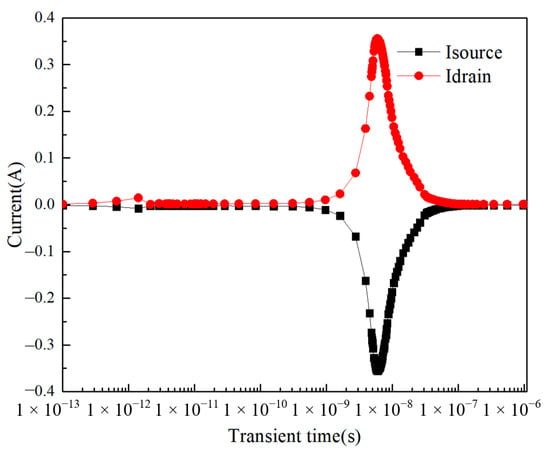 For the second peak, which occurs later, charge is collected at the drain and source. The heavy ion incidents then ionize the electron–hole pairs inside the device, where the charge takes longer to move because of the greater distance from the source and drain, resulting in the peak that occurs later than the first peak current. Under the action of the source–drain electric field, the charge is collected by the source and drain, forming the second current peak. The figure shows the relationship between the source current and drain current when the heavy ion is incident at point i. As can be seen from