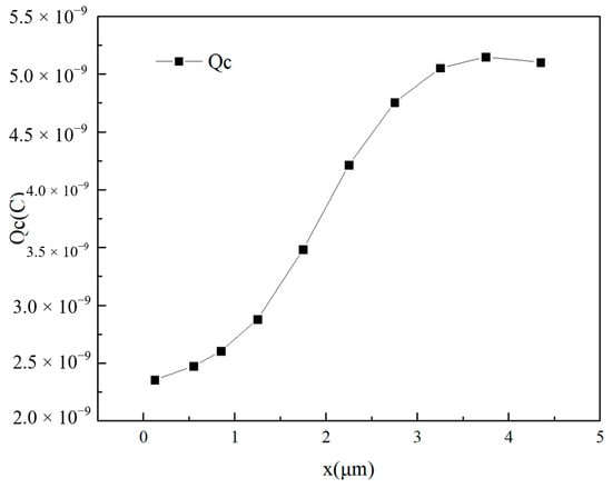 Figure 9 shows the total charge collected by the drain as a function of the heavy ion incidence position. x represents the distance from the source of the point of incidence. It can be seen from the figure that during the change in the incidence position from source to drain, the amount of charge collected first increases and then decreases slightly, and maximum values appear near the edge of the drain. It can be inferred that for GaN HEMTs, the drain is the most sensitive region for single-event transient effects.