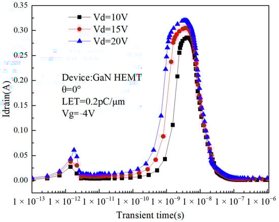 From the analysis above, it can be seen that the internal electric field distribution of the device has a great influence on charge collection. The transient effects of GaN HEMTs are studied by changing the drain bias and then changing the internal electric field of the device. The simulation result is shown in