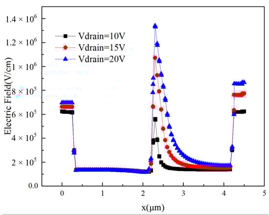 Figure 12 shows the distribution of electric field strength in the device along the direction of the 2DEG channel when the drain voltages are 10 V, 15 V, and 20 V, respectively. It can be seen from the figure that the increase in drain voltage leads to an increase in the electric field strength inside the device, especially near the gate region and the drain region; the increase in the electric field strength makes it easier for the electrode to collect electron–hole pairs, and the increase in the collected charge leads to an increase in the transient peak current. Abbate and Ngom et al. experimentally compared the single-event transient current of GaN HEMTs with different drain voltages [