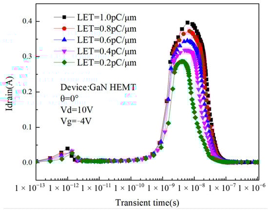 Figure 13 shows the effect of LET values on single-event transient currents. For heavy ions in space, the LET values range is about 0.2~1.0 pC/μm, according to which the relationship between the single-event transient current of GaN HEMT with time is simulated when the LET values is within this range.