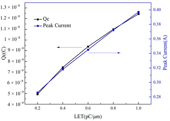 11]. When the LET value is 0.2 pC/μm, the second peak current is 0.286 A, and when the LET value is 1.0 pC/μm, the second peak current reaches 0.397 A, which is an increase of 38.8%. For a determined material, due to its average ionization energy determination, when the heavy ion is incident, the larger its LET value, the greater the number of electron–hole pairs it can ionize, the more charge collected by the drain, and the higher the peak current. As the LET value increases, the pulse width increases, but the drain current does not increase earlier. This is because the change in LET values does not cause a change in the internal electric field distribution of the device and does not affect the back-channel effect of the device, so the time of charge enhancement does not change.