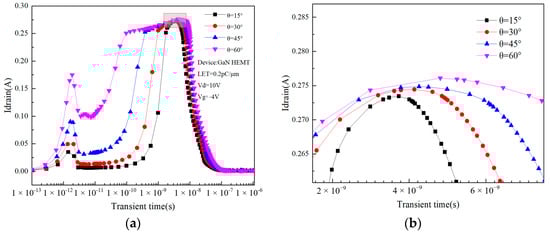 Figure 15a,b. It can be seen that as the incidence angle of heavy ion increases, the transient current peak width increases significantly, but the peak change is minimal. When the incidence angle is 15°, the peak drain transient current is the smallest, which is 0.273 A, and when the incidence angle is 60°, the peak drain transient current is the maximum, which is 0.276 A.