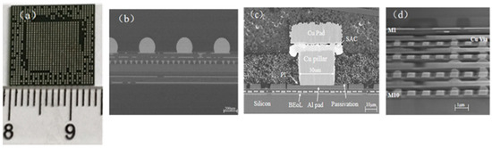 (a) Size of device. (b) Cross-sectional view of the whole package. (c) Cross-sectional SEM image of copper pillar interconnection. (d) Cross-sectional SEM image of BEoL.