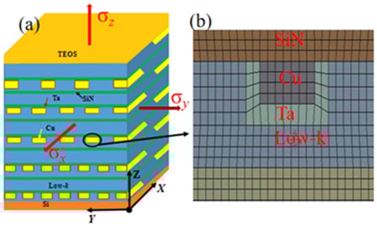 In order to accurately calculate the stress distribution in the global model, the complex BEoL structure should be taken into account. This was executed by obtaining the effective mechanical properties of an RVE, which correspond to the typical BEoL structure, using finite element (FE) simulations. Such an RVE is illustrated in Figure 3a. The RVE of 4 × 4 × 8.2 μm3 in dimensions has a 10-layer Cu interconnect structure (Figure 1d), and the interconnect metal-layer is packed with a porous dielectric material. The Ta layer, as the diffusion barrier for Cu, and the SiN layer, as an etch stop, were both modeled, as shown in Figure 3b. The vertical Cu vias which provide signal transfer vertically across metal layers were assumed to be a transversely isotropic material. A uniform axial stress, x, was firstly applied to the RVE in the x direction, and the corresponding elongation, ΔL, was obtained using finite element analysis (FEA). The effective elastic modulus, Ex, and position ratio μyz in the x direction, μyz, were then obtained through Equations (1) and (2), respectively: