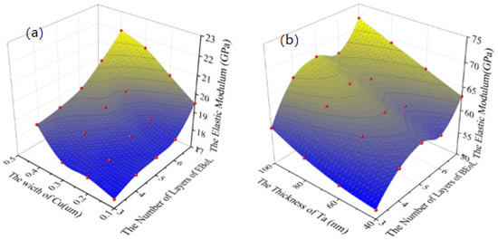 The results are plotted in Figure 4. The red points are the results of the FEA which are fitted by surfaces. The out-of-plane elastic modulus of the BEoL stack increases as the Cu width and the number of layers increase. This is mainly because the elastic modulus of the interconnect material, Cu (121 GPa), is much higher than the elastic modulus of the low-k dielectric (10.6 GPa); therefore, increasing the width of the Cu directly leads to an increase in the out-of-plane equivalent elastic modulus. Similarly, increasing the number of layers in the BEoL structure increases the volume fraction of Cu in the BEoL structure, resulting in an increase in the out-of-plane elastic modulus.