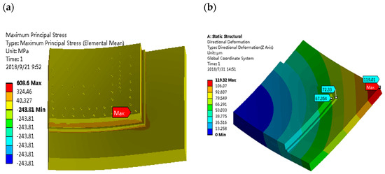 (a) Stress distribution in the package at 260 °C. (b) Warpage of the package at 260 °C.