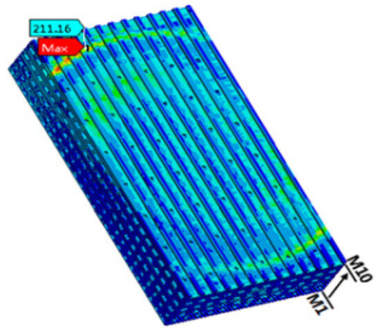 It is expected that the first failure should occur in the BEoL stack immediately below the critical bump that is located farthest from the center of the chip. A local submodel for a much finer scale than the global model was established, as shown in Figure 2. Following the conventions of submodeling techniques, the displacement boundary of the submodel region in the global model is introduced to the local model by interpolation, serving as the displacement boundary conditions for the submodel. The distribution of maximum principal stress is shown in Figure 8, where it can be seen that the maximum stress of about 211.16 MPa is located in the low-k (M10) layer closest to the critical bump. This level of stress arising at the critical bump can cause delamination or cracking in the BEoL stack, leading to device failure.