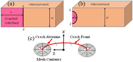 It is assumed that the major axis of the semi-elliptical interfacial crack is 0.30 μm and the minor axis 0.1 μm. A number of mesh contours were specified for meshing purposes as illustrated in Figure 9c. The optimum numbers of crack front divisions and mesh contours were set at six and five, respectively, for proper computational accuracy and efficiency.