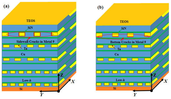 First, we considered the competitive crack propagation between cracks in the sides and bottoms of the interconnects in each metal layer. For this, interfacial cracks were first assumed to occur on the vertical sides of all the interconnect lines in a specified layer, and finite element simulations were performed in order to obtain the ERR. Figure 10a illustrates the case for M9. In this manner, the ERRs for sidewall cracks in each layer of the BEoL were calculated. Similarly, interfacial cracks were next assumed at the bottom of all the interconnects at each layer in turn, and the ERRs were calculated.