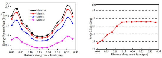 The variation of ERR and mode mixity along the crack front 1–2 (Figure 9c) of a typical semi-elliptical crack at the bottom of the interconnects at different layers is shown in Figure 11. It can be seen that the distribution of ERR is approximately symmetric around the center of the crack front but slightly skewed towards the right because of the loading direction. The largest values of the ERR are not at the start of the crack front, (Point 1) nor at the end (Point 2), but are quite close to them. The lowest ERR occurs near the center of the crack front. From Figure 11b, it can be seen that the mode mixity is lowest at the beginning of the crack front (Point 1) and increases linearly along the crack front until about the middle of the crack. Thereafter it remains almost constant.