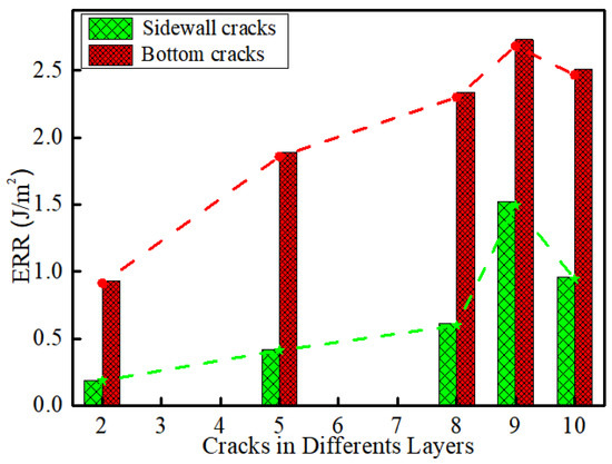 The largest ERR of each of the side cracks and bottom cracks are plotted in Figure 12. It can be seen that, as the layer number increases, the ERR for both the sidewall cracks and the bottom cracks increases except for in the very last layer (M10), in which it decreases slightly. A similar trend was observed by Zhai et al. [19] for a flip chip with nine metal layers where M1–M7 had low-k ILD, while M8 and M9 had stiffer oxide ILD. They found that the largest ERR occurred at M6, with that at M7 slightly lower and those at M8 and M9 much lower as their ILD was an oxide. It can also be seen from Figure 12 that the ERR for the bottom crack at each layer is always greater than those for the sidewall cracks. Hence, for the chip studied here, layer M9 is most likely to fail first from a crack at the bottom of the interconnect.