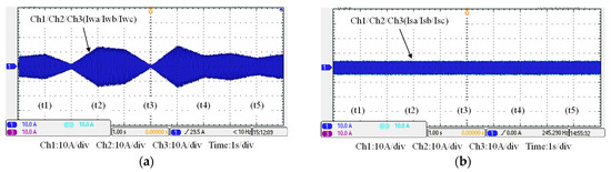 The hardware experimental system in this paper adopted a WT emulator in the laboratory and an experimental 200 V, 10 A battery bank as the WTGIC’s ESU. Considering the voltage specification of the existing laboratory battery, the three-phase AC system representing the power grid was designed at 110 V; the DC and AC voltages of the modular three-phase inverter were designed at 200 V and 110 V/60 Hz, respectively; and each single module inverter was rated at 1 kVA, using six power semiconductor devices rated at 500 V/26 A. The bidirectional inverters were developed using two Texas Instrument DSP F28335 devices as the main controllers. Other experimental units included a personal computer (PC), self-made control interface circuits, voltage and current signal sensing and adjustment modules, driving and protection modules, various DC power modules, and a three-phase isolated transformer. Figure 18 shows the schematic configuration of the developed hardware and signals of the WTGIC. Figure 19 shows a photograph of the WTGIC hardware and the experimental environment. The operating conditions and system parameters of the cases are the same as those used in the simulation studies. Figure 20 shows the measurement points of the voltage and current waveforms.