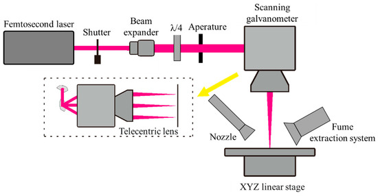 In recent years, lasers have been used extensively for material processing [9,10]. Ultrafast laser processing is an exceptionally versatile option for many applications that can guarantee a high level of control of the process owing to its ultrashort timescale and ultrahigh peak power density characteristics [11,12]. This technique has already been employed as part of highly selective processing technologies with limited heat-affected zones to provide low distortion, high quality, and precision, particularly for hard and brittle materials [13,14]. Recently developed industrial femtosecond laser sources exhibit high average power (>100 W) and pulse energy (>100 µJ) with a high repetition rate (up to 10 MHz) and short pulse duration (<500 fs) [15,16,17]. By combining the high speed and precision of scanning galvanometers with the properties of high-power femtosecond lasers, these lasers can be applied not only to micro–nano fabrication but also to flexible production processes at high processing speeds and material removal rates with a low total cost of ownership. Furthermore, as high-power femtosecond lasers have become more reliable and efficient, they can be used for automatic processing to meet the demands of flexible production processes [18], particularly for the manufacturing of products with a high demand for yield and cost-effective production. Lastly, ultrafast laser processing is a stress-free method suitable for processing thin-walled components.