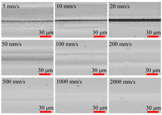 In this study, a series of experiments were conducted using femtosecond laser processing to analyze the influence of the laser scanning speed on the material removal rate. Analyzing the morphology of the grooves processed by the femtosecond laser under different scanning speeds represents a basic experiment to investigate the thermal effects and changes in the chemical composition of the sample. These experiments can also be used to determine the optimal processing speed. We analyzed the morphologies of laser-processed grooves under different scanning speeds at a laser power of 4 W (500 kHz) using scanning electronic microscopy (SEM, ZEISS Gemini 300, Oberkochen, Germany). These results presented in Figure 2 show that a significant amount of the laser ablation product was deposited on or near the processing grooves when the scanning speed was below 200 mm/s. SiO2 is produced when the silicon from the SiC ceramic reacts with oxygen at high temperatures induced by femtosecond laser pulses [18,19,33]. When the scanning speed is low, the SiC ceramic receives more laser energy per unit area, leading to significant heat accumulation. The produced SiO2 deposits on the surface, thus preventing the removal of the SiC ceramic. The most abundant SiO2 deposits were found at the processing edge and decreased with increasing distance from the processing groove. As shown in Figure 3, the SiO2 produced at a laser scanning speed of 5 mm/s presented a white or grey batt-like aspect and had a certain binding force with the surface. By increasing the scanning speed, the amount of laser ablation products gradually decreased. When the scanning speed exceeded 500 mm/s, no obvious oxide deposition was observed on the processed grooves. Therefore, at a fixed power, the amount of oxidation products in the processing area is inversely proportional to the laser scanning speed.